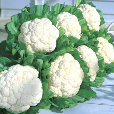 Brassica oleracea (botrytis group) (60 days) F-1 hybrid. Short stems bear compact 1-2 lb uniform firm white tight heads with fine beads. Early, but less dense than later varieties.