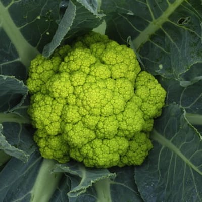 Brassica oleracea (botrytis group) (76 days) F-1 hybrid. Lively bright green cauliflower with great texture raw and cooked. Stays green when cooked. Hefty heads.