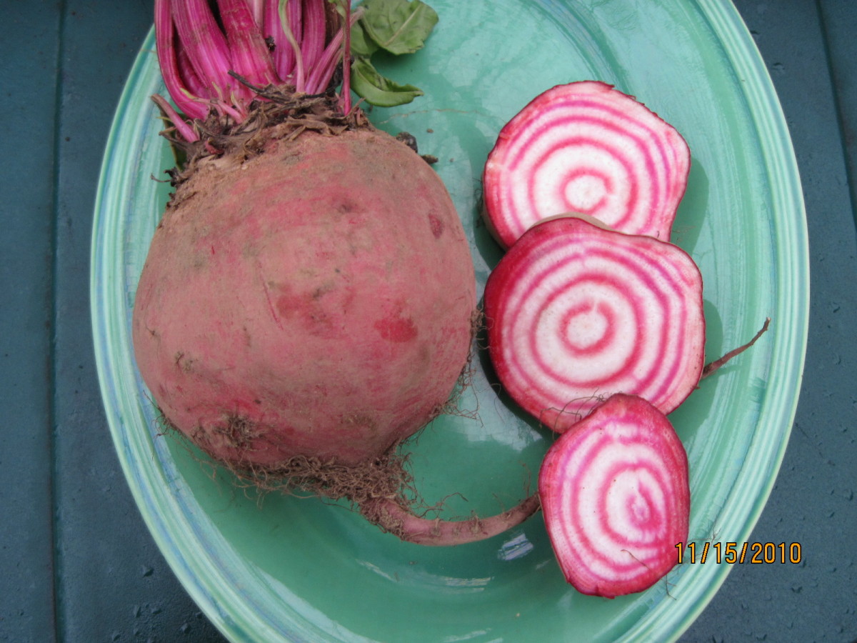Beautiful when sliced, this heirloom home-garden type attracts attention in the kitchen with its alternating interior rings of pink and white. Noteworthy also for its light red exterior color, green tops and exceptional sweetness. It loses quality when it gets large. Also known as Bassano, for the Venetian hill town where it originated. Has been cultivated in the States since the 1840s, was listed by Fearing Burr in 1863, and offered by Vick’s for 75¢ per lb in 1877.