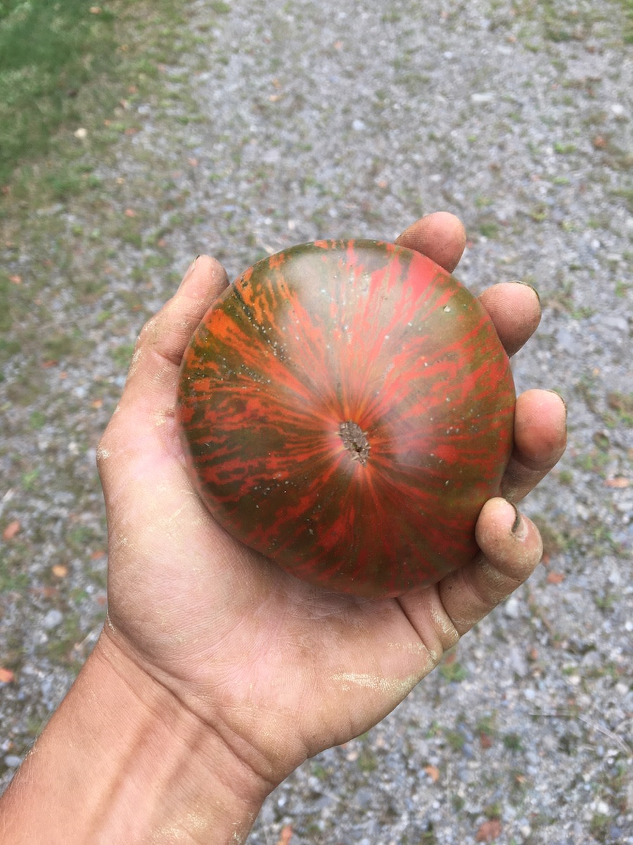 Indeterminate. The talented plant breeders at Wild Mountain Seeds took two strains—Chocolate Stripes bred by Gary Ibsen and Large Barred Boar by Brad Gates—of this brick-red metallic-striped tomato and selected for size, strong stems, early-season vigor, disease resistance and productivity. We can vouch for their success: plants are extremely vigorous and productive with uniformly round medium-large 10–15 oz fruits, delicious with a complex fusion of sweetness and earthiness. Fruits hold well off the vine so a great pick for market gardeners.