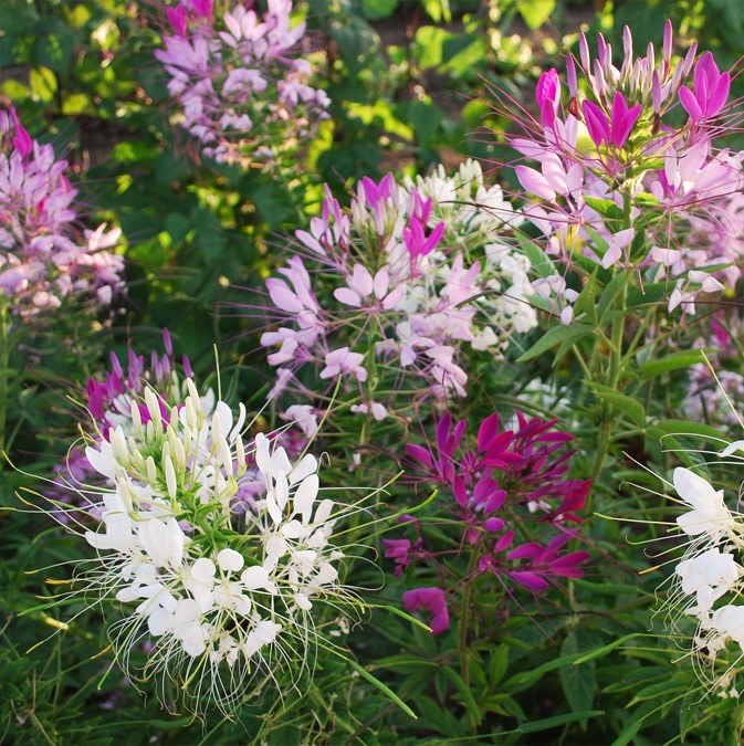 Annual. The Spider Flower sets large open flower clusters with very long stamens atop 4' stalks. Blooms throughout the summer and likes the hot and dry conditions of midsummer. Very attractive to bees. For better germination, prechill seeds in refrigerator. Do not cover seed. Likes alternating day (80°) and night (70°) temperatures to germinate. Will self-sow.