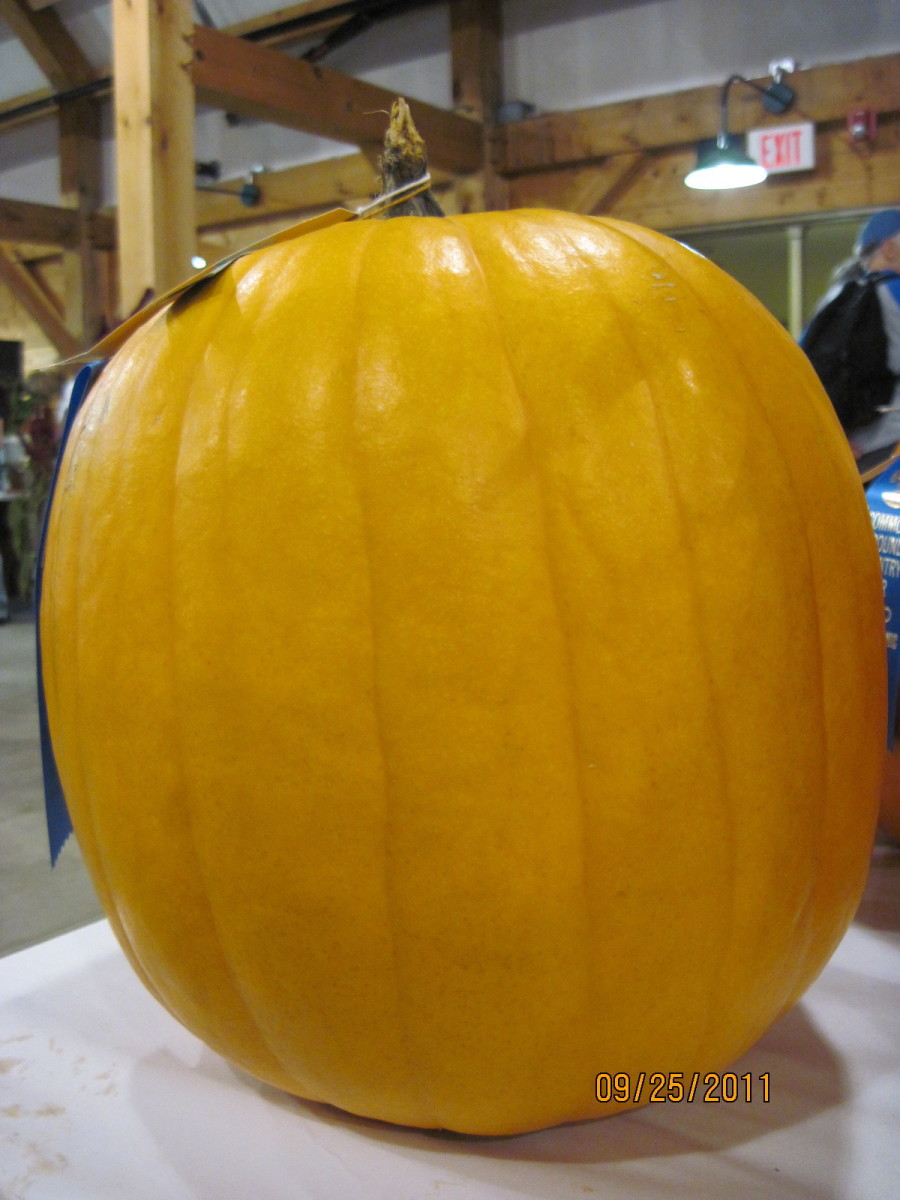 Also known as Big Tom. Grown for jack-o’-lanterns and stock feed, gets 15–25 lb, sometimes more. Not uniform in size or shape. Heirloom grown by Native Americans, adopted by colonists before 1700, and a staple of 19th-century catalogs. Vick’s offered for 10¢ an oz and 50¢ per lb in 1877. Ripens for us in good years, but often we must pick green.