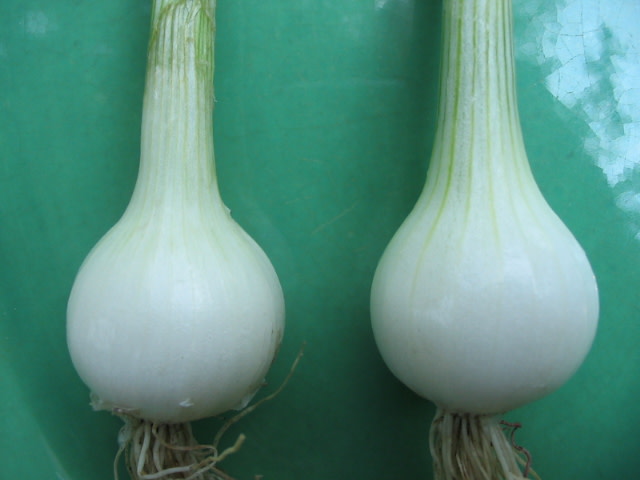 Unlike most onions, these can be direct-seeded in spring with the peas. Then the 1½" pearly white bulbs ripen with the peas for early summer baby onions or pickles. Orbs the size of ping-pong balls were ready to harvest on July 7 in central Maine. Resists PR.