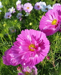 Annual. These shimmering delicate beauties were named for the pleating of cupcake papers, evoked by the intricately fused folding of the outer petals. But not described is how the lightweight blooms seem to float on upright stems, more like ballerinas pirouetting in tutus of white and pinks than like cupcake papers. Even better, some of the blooms are doubled, with extra petal tufts surrounding a central yellow button, making for a charming profusion of frills: a scene stealer in the garden. The 4' tall plants attract pollinators and have long stems for cutting. Deadhead to keep the blooms coming. Full sun.