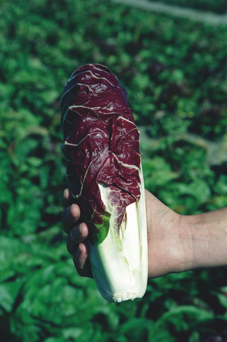 Beautiful elongated upright radicchio. Deeply ribbed leaves with a branching pattern; the whitish veins blush green along the margins and branches, creating a spectacular color contrast with the purplish background. Early and delicious, a reliable header.