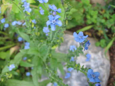 Annual. Also known as Hound’s Tongue. Uniquely bright dainty 5-petaled azure-blue blossoms. Floriferous throughout the summer with three blooms per cluster and a half dozen clusters per plant. Try alongside calendula for color contrast. Introduced by Ernst Benary. 1939 AAS. Start indoors 6 weeks before the last frost or direct seed outdoors in spring. Germinates in 5–10 days at 65–70°. Space plants 9" apart. Prefer full sun. 16–18". Annual. ~200 seeds/g.