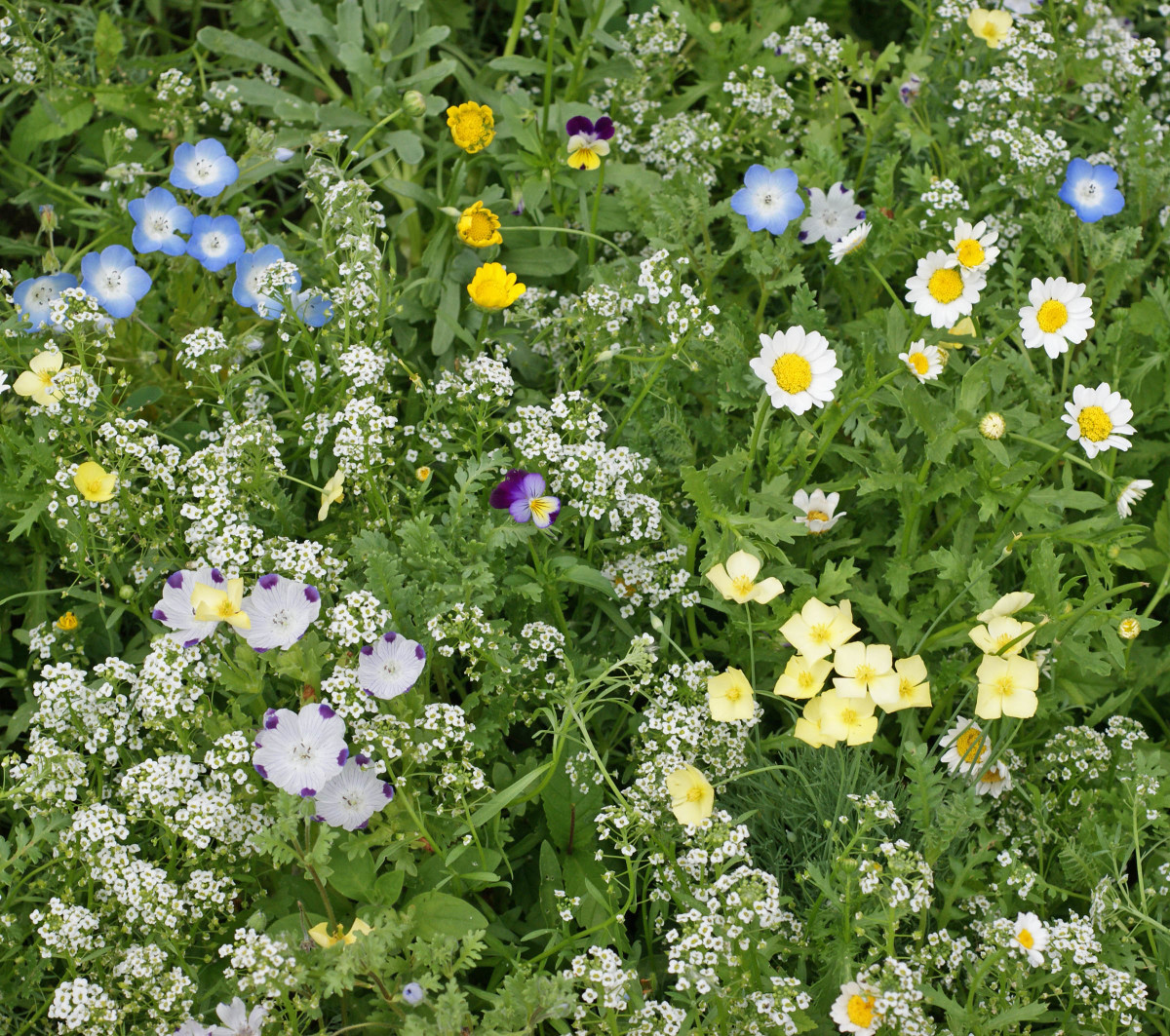 Mix contains some or all of the following: Wild Thyme (Thymus pulegioides), Yellow Daisy (Chrysanthemum multicaule), Baby Blue Eyes (Nemophila menziesii), Creeping Clover (Trifolium repens), Creeping Daisy (Chrysanthemum paludosum), Dwarf California Poppy (Eschscholzia caespitosa), English Daisy (Bellis perennis), Five-Spot (Nemophila maculata), Johnny Jump-Up (Viola cornuta), Roman Chamomile (Chamaemelum nobile), Sheep Fescue (Festuca ovina), Strawberry Clover (Trifolium fragiferum), Sweet Alyssum (Lobularia maritima)