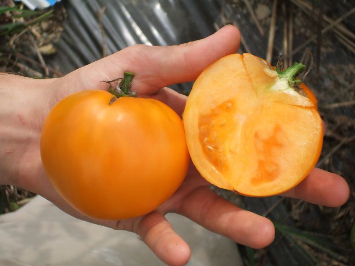 Indeterminate. The best medium-sized open-pollinated orange tomato, Jubilee ripens smooth-textured sweet mild meaty 8 oz globes. Amy Goldman describes its flavor as “sprightly” and says it was a favorite of Ben Quisenberry of Big Tomato Gardens in Syracuse, OH, who offered it under the name Golden Sunray.