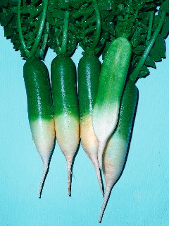 Unique miniature daikon radish with striking lime-green flesh grows 6–9" long and 1–3" wide. The above-ground exposed shoulders turn a deep green while the tips remain white. Fine-grained, crisp and sweet. Fedco Staffer Clayton says it has a “distinct green-apple flavor.” Used in Asia for salads, cooking and pickling. David Nonnenmacher suggests trying a slice on homemade bread slathered with butter. Green Meat and Misato Rose keep in his root cellar until May.
