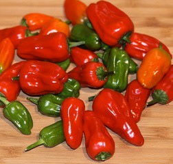 Not for the “chickenhearted,” this rare Pennsylvania Dutch heirloom packs considerable heat. Its name aptly describes the size and shape of its ¾ x1½" pendent peppers that taper to a blunt point and are covered with tiny bumps and wrinkles, like chicken hearts. Ripening from green to red, the tough skins when cut open emit a fruity redolence and reveal a thick juicy flesh. Rarely eaten raw, the peppers were traditionally used for pickling and pepper vinegar. Nearly as hot as habaneros, they do not require quite as long a season, nor are they as picky in cool environments. Plus they are compact enough to grow in a pot to bring inside for the winter. Hinkelhatz has boarded Slow Food’s Ark of Taste. Thank you, Amy LeBlanc, for bringing it to our attention. About 125,000 Scovilles.