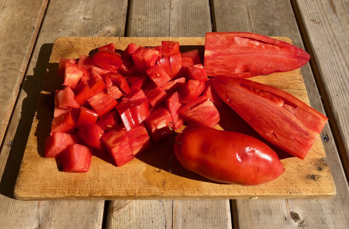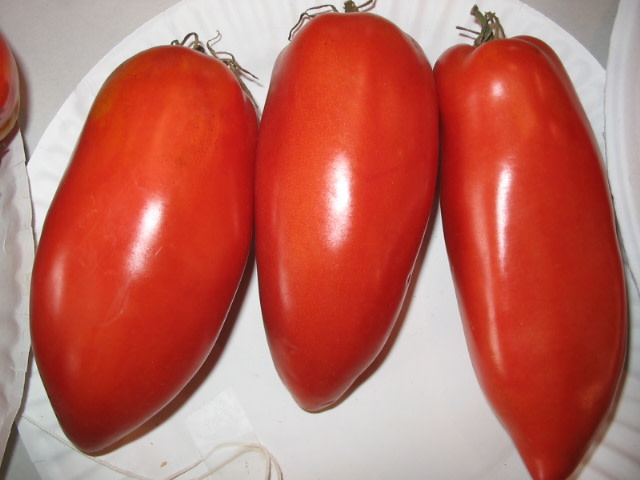 Indeterminate. Brought from Italy to Massachusetts, probably between 1910 and 1920, and then by Susan Eastman and Ed Lacy of Gray, Maine, to the Exhibition Hall at the 1988 Common Ground Fair, Hog Heart has won many admirers. So-named because it sometimes produces large heart-shaped double fruits. Elisabeth Benjamin grew a triple in 2013 that weighed 3 lb 7 oz! More often, though, its 6–8 oz tomatoes are shaped like banana peppers. A meaty paste tomato noted for its sparse seed cavity, good solids and excellent flavor fresh, canned or frozen. It is late for extreme northern areas and some fruits catface. “For my money the best paste tomato going,” says “Tomato Lady” Amy LeBlanc. 1999 Fedco introduction.