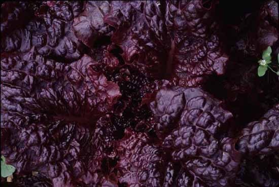 If you are drawn to really deep red lettuces, consider Hyper Red. Selecting from a cross between Valeria, a very red cold-tolerant lollo rosso, and Wavy Red Cos, an undulating savoyed red romaine, Frank Morton bred Hyper Red to accentuate pigmentation and ruffling. The striking result tastes good with a pleasing texture. You can hear Morton talk about the breeding of this variety on OSSI's Free The Seed! Podcast.
