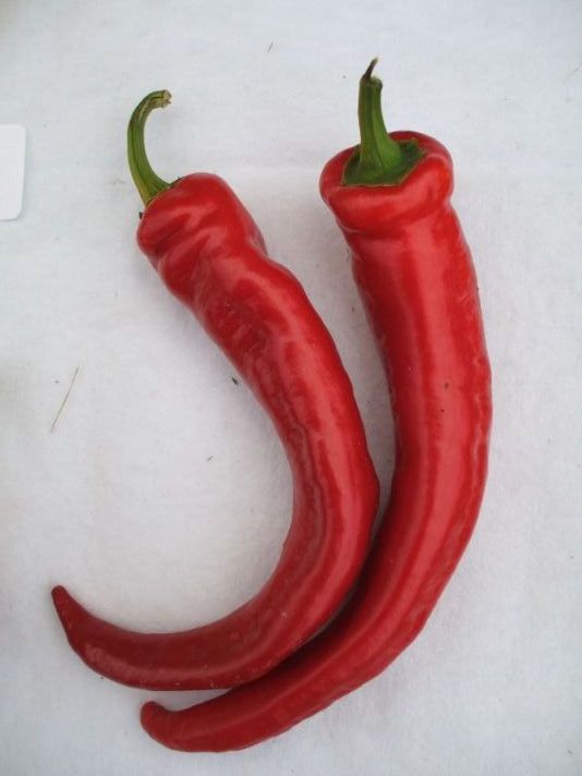 This thin-walled 8" frying pepper has won many converts. The long curved tapering pointed fruits turn deep red with shiny wrinkled skin when ripe. Pleasing sweet mild flavor, good raw, in stir-fries and, especially, fried. According to Nardello family relative Patty Ruprecht of Pownal, Maine, “the only way to eat them is to string them, dry them, fry them and salt them.” Eat them plain or “better still as a sandwich on Italian bread with a slice of provolone.” Listed on Slow Food’s Ark of Taste. Brought to Connecticut from the village of Ruoti in the Basilicata region of southern Italy in 1887 by Jimmy Nardello’s mother.