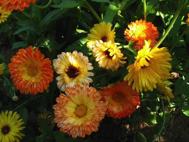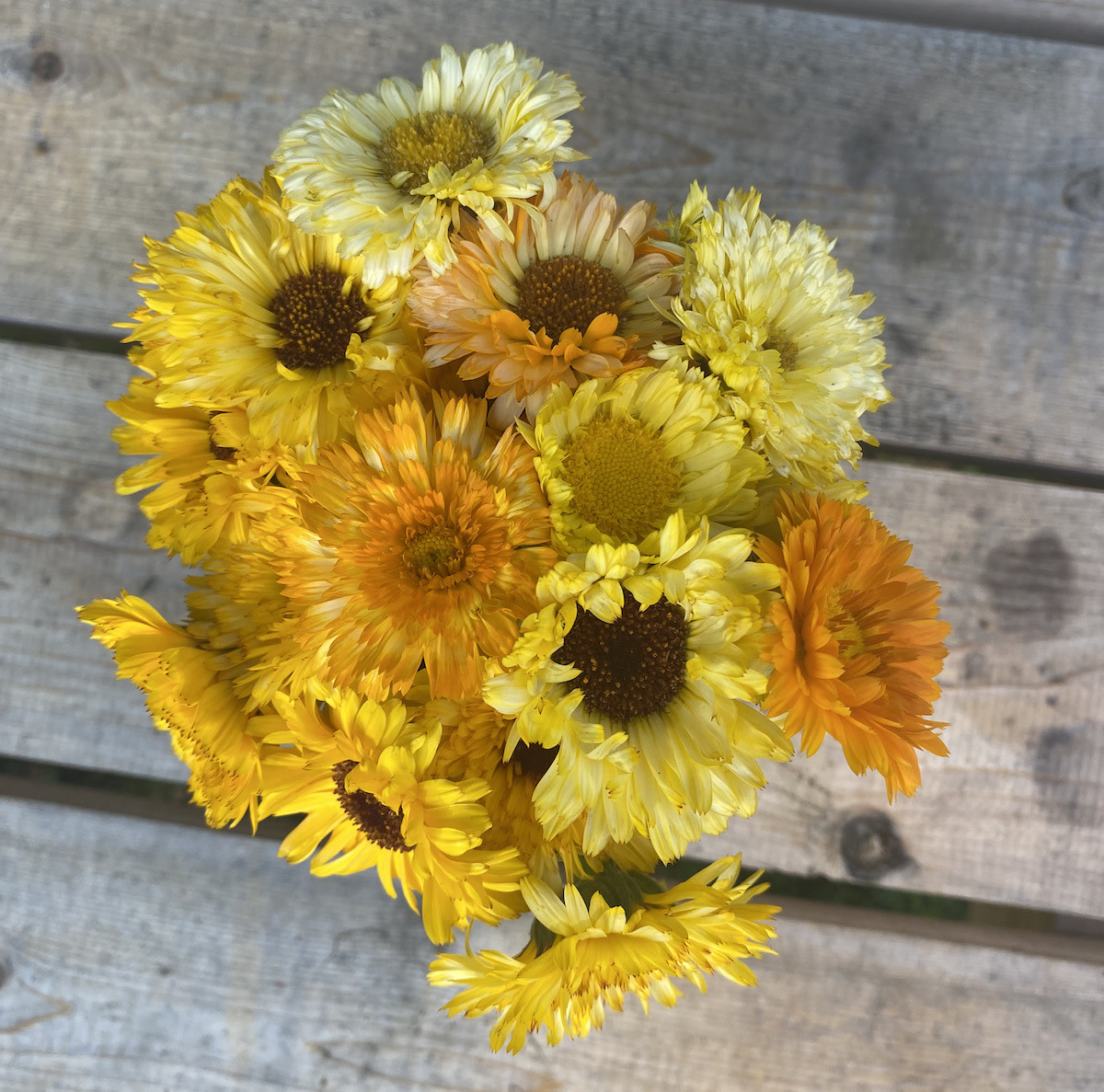 Annual. Distinct refined form features striking crested mostly yellow blooms with dark contrasting centers. One of the loveliest of the calendulas. Kablouna, our seed room goddess who looks after the good fortune of seed packers, is currently at large.