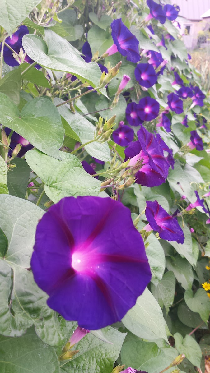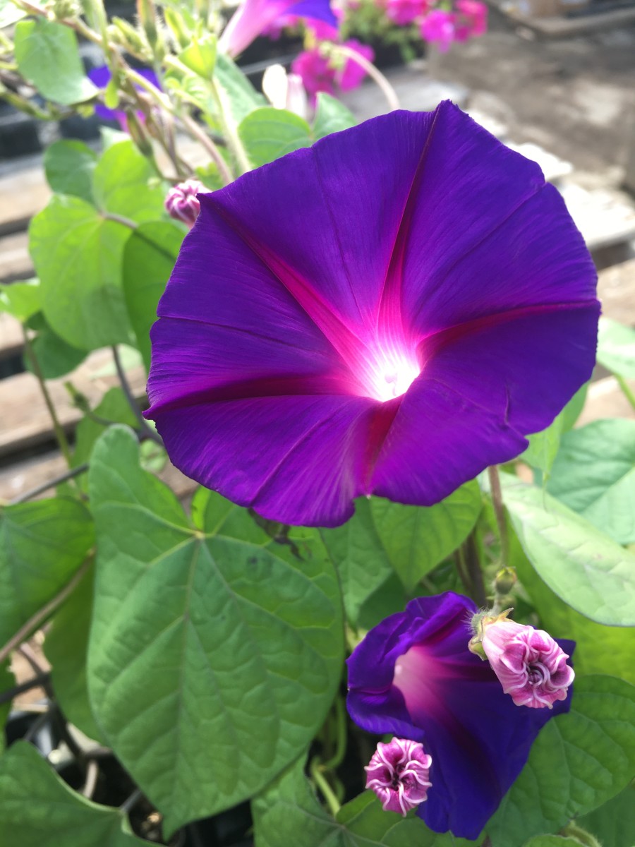 Annual. Glowing rich deep purple flowers vibrate against lush green foliage. Unlike most other morning glories, Kniola’s starts blooming while it is only 2' tall and still vining. As the vines climb on to 8–9', the blooms continue, lasting the entire season. The deep flowers have a magenta star that radiates out from their pale pink-white throats. An heirloom discovered by Mr. Kniola at an abandoned farm in Indiana. Nicholas Lindholm acquired seed from J.L. Hudson in 1993, thence passed it on to Roberta Bailey who has been maintaining it and culling out the magenta off-types.