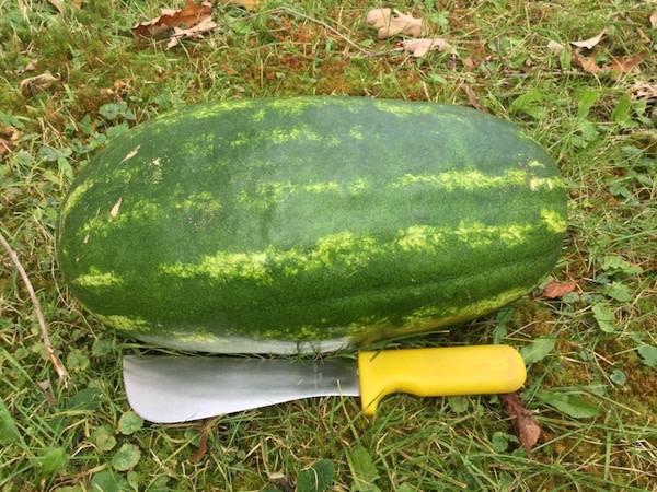 An extra big and bulky elongated Sangria-type with intensely sweet deep red flesh, this beast rocked the scales at 15–20 lb even in Maine’s cool slow-starting summer of 2019. Three monsters per plant were cut from thick rambunctious vines more akin to winter squash in vigor. Long keeping and shipping qualities result from a solid rind thickly swathed in dark green with thin light streaks.