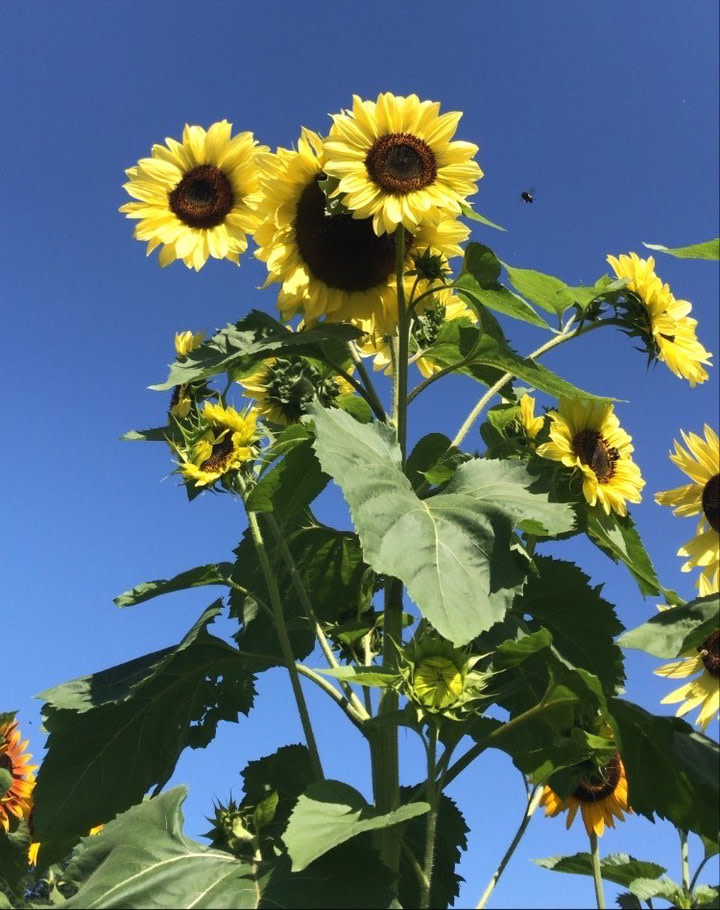 Annual. Luxuriant 8" blooms with lemon-yellow petals surrounding striking solid brown centers. Although it can grow up to 10' tall in rich soil, its powerful stems do not lodge. Likes high fertility; makes shorter stems and narrower petals in average soil. Not early; bloomed for Donna Dyrek in late August. ~45 seeds/g.