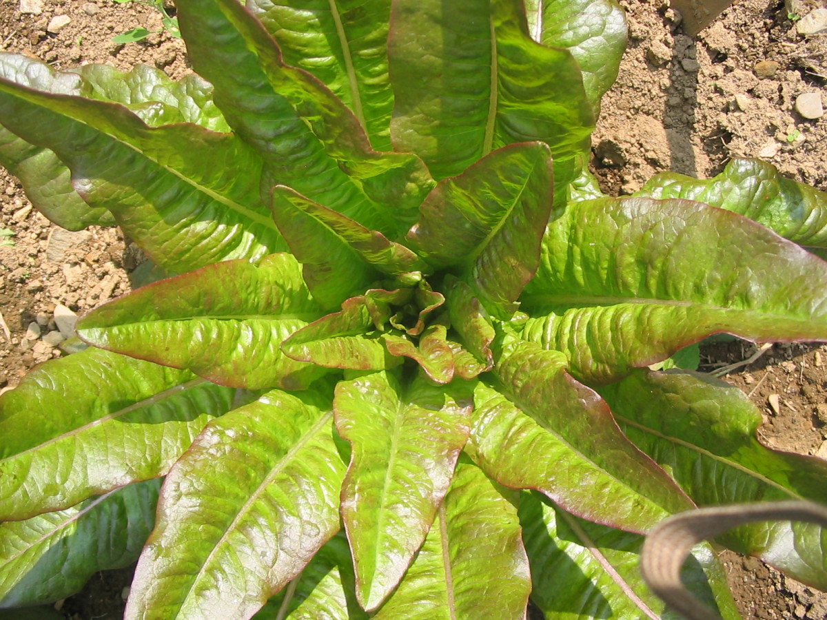 Starlike rosettes of tasty glossy leaves are deeply tinged with burgundy for a shimmery appearance. We enjoy its nutty texture and bitter-free flavor. One of the last to bolt. A standout in our plots where we greatly preferred it to Red Deer Tongue for its color and good heat tolerance. One of the lovely rare treasures once maintained by the Abundant Life Seed Foundation.