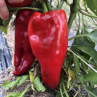 Capsicum annuum (76 days) Open pollinated. Shiny red thin-walled 8" long tapering frying pepper. Sweet mild flavor, good raw and especially fried. High yielding.