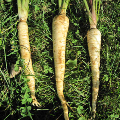 Pastinaca sativa (120 days) Open pollinated. Outstanding variety. Those with good tilth can get refined tapered cylindrical roots 12-14" long.