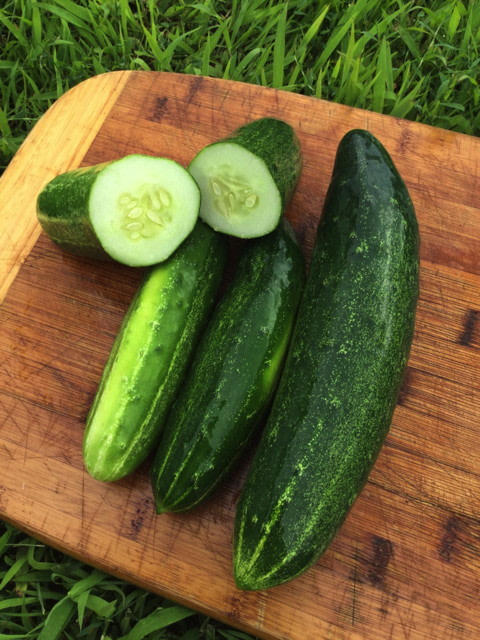 Extra-good Fellow came into picking mid-late season, but we found the 8–9" long and 2" wide stage to be eating perfection: skin crunchy but not tough, sweet and full cuke flavor, flesh crisp but then immediately juicy and melting, with a small seed core. Steady vigor and yield with few duds. Light green and striped blossom end.