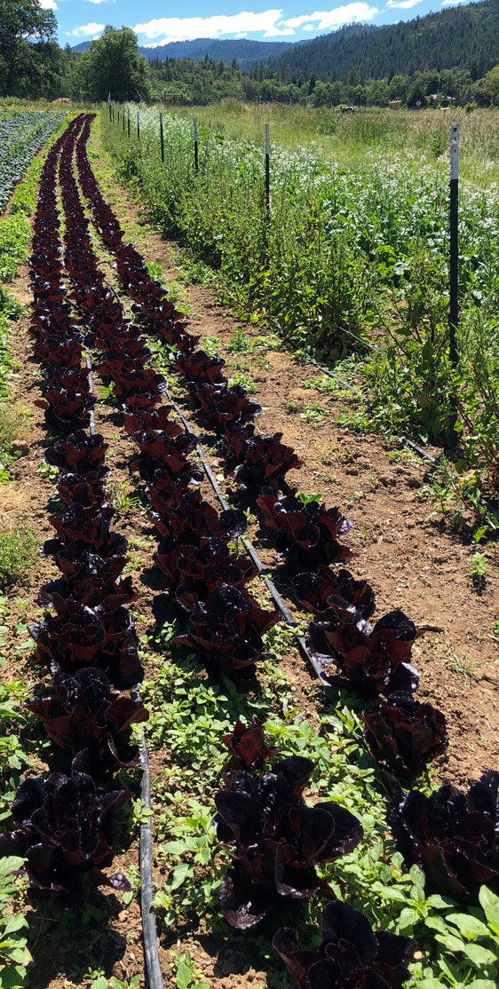 We first discovered Marshall in the Territorial catalog: “Gazing into the heart of this romaine is like falling into a burgundy abyss.” As Merlot is to looseleafs so Marshall is to romaines, the standard for color intensity. Deep dark red leaves with contrasting pink veins, and a smidgen of light green in the center. Tall upright 8" heads. Leaves smooth and succulent, crisp and chewy, lacking the bitterness usually associated with such coloration. Ornamental and delectable.