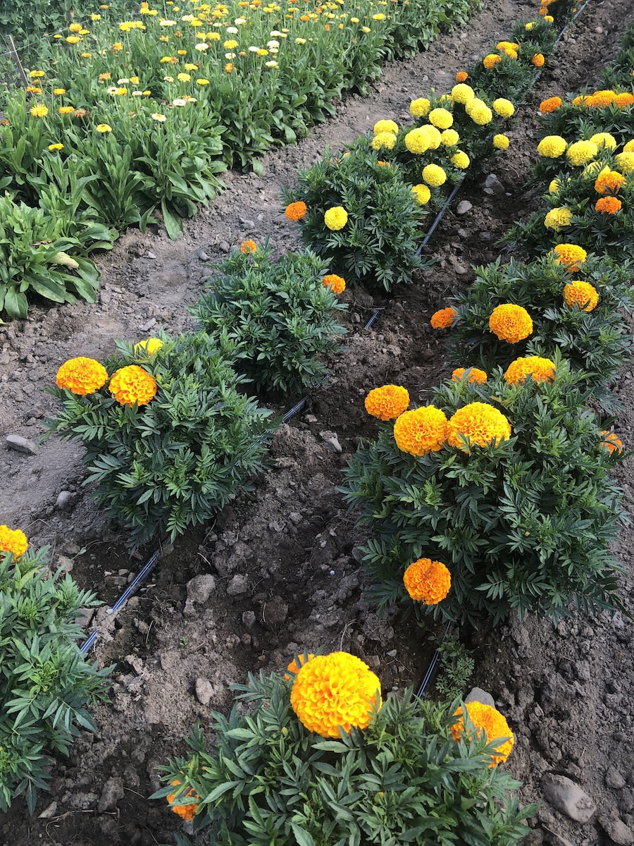 Annual. Fully double 4" pompon blooms in gold, orange and yellow are perfect for stringing into garlands. Early to bloom. Sturdy 18" plants with excellent branching habit do not need support.