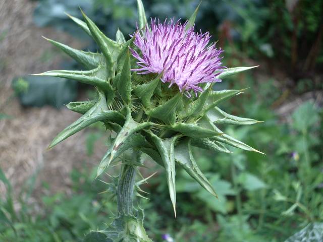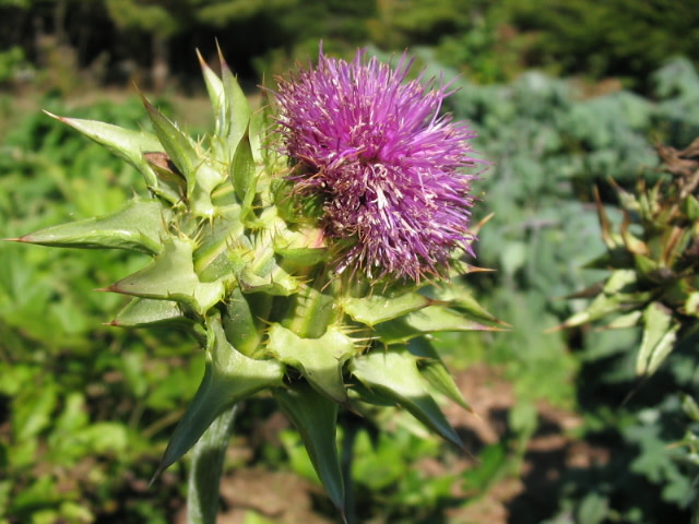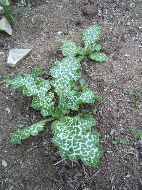 Annual. Named for the bold white splashes on its glossy leaves, said to be from Mary’s milk. Fast-growing, 3–5', with leaves up to 8x24". Native to the Mediterranean. Use young leaves cooked or in spring salads; remove spines first! Flower stalk puts out large purple thistle flowers that were eaten like artichokes. Silymarin, found in the flowers and seeds, has been used to strengthen and regenerate liver tissue. Will self-sow; pull unwanted volunteers before they get big and prickly. May present a way to outwit raccoons: Chris Mazur of Apple River, IL, planted some around his sweet corn patch, and the raccoons ravaged the rest of his garden, but did not molest his corn. Likes dry soil, very tolerant of drought. About 40 seeds/g.