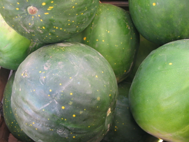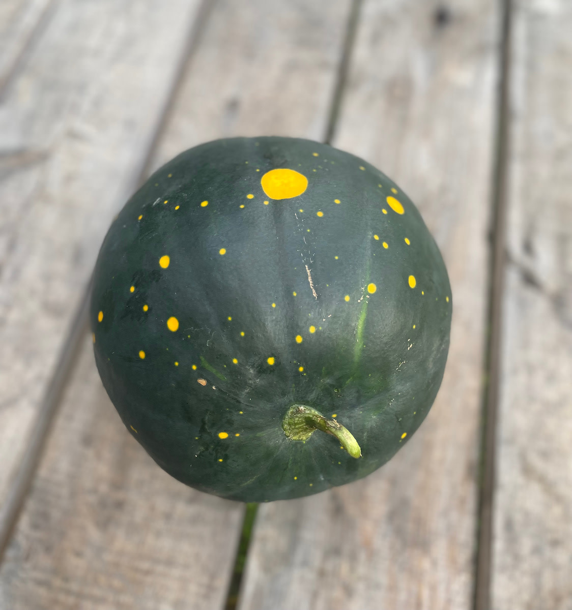 Dark green skin has beautiful yellow spots which range in size from little peas (the stars) to a silver dollar or larger (the moon). Sweet (9.7% Brix) somewhat grainy pink flesh, and such a looker!