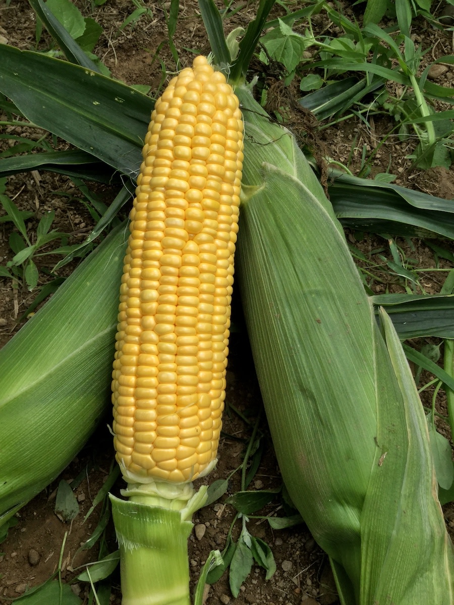 Yellow, 8–10" ears, 16–18 rows. We have yet to launch our hootch-trialing program, so we can’t say if this corn lives up to its name in that regard. We do know it’s the preferred full-season Supersweet corn for those of us with slow springs, as it emerges well in cool soil compared to other Supersweets. Bright yellow short-shanked ears have deep full kernels with a high sugar level that does not overpower the flavor. Good husk protection of ears on 7' plants. Intermediate resistance to rust (Rp1-d), ST and NCLB. Isolate from all other corn types by 300 feet.