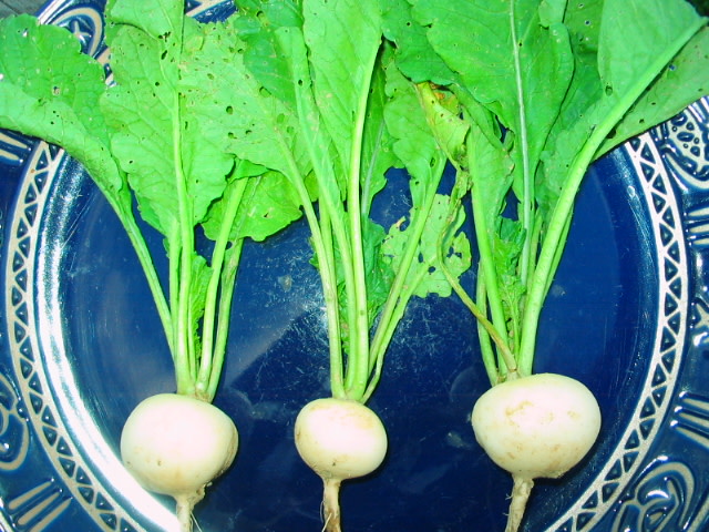 The closest we’ve found to the much-sought-after Hakurei turnip, sharing many fine features: smooth round globes, refined pure white color, delicate sweet fruity flavor and crisp tender texture so suitable for salads and light cooking. Our purchaser Nikos Kavanya esteems it highly and people now come in to her garden asking to snack on it by name. Good for fall as well as early summer crops. Best harvested at bunching size, but retains quality for a while. Tolerant to DM. Tested negative for BR and BL.