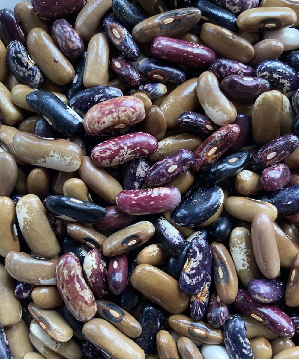 As seed keepers, students at Troy Howard Middle School in Belfast, ME, rogue out any bean crosses as they shell heirloom varieties each fall. As plant breeders, they can’t resist growing out those crosses to see what happens! Dubbed “weirdo beans,” these glorious mutts spin out a ragtag rainbow of patterns, habits and ancestral forms. Like middle schoolers, they are colorful, unpredictable and, well, kinda weird. From the ranks of these hybrid misfits, Troy Howard proudly presents the PB&J Nebula Gene Pool! Lightly selected for vigor, yield, disease resistance and bush habit, but maintaining a high degree of diversity, these beans outyield almost all the other beans in the school’s collection. Parentage includes a bean called Tarahumara (presumably from the Rarámuri of Mexico, though the lineage is not certain), Bumblebee, and unknown others. The predominant forms are a range of peanut-butter browns and a constellation of jelly-colored nebular swirls with unexpected variations here and there. Great potential for selecting out new varieties—just keep them free under the OSSI pledge! F5 generation. Seeds grown and packed by the students—we split the proceeds.