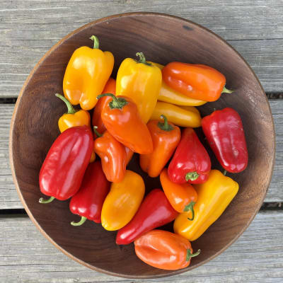 Capsicum annuum (85 days) Open pollinated. Beautiful tangerine color. Plants ripen more than a dozen of these small 2-3" round to slightly flattened thick-walled sweet and juicy fruits in a good year.