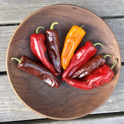 Capsicum annuum (80 days) Open pollinated. Red-orange 3x6" horn-shaped fruits taper to a blunt point. Sweet and mildly spicy; 500-1,000 Scovilles. Heirloom.