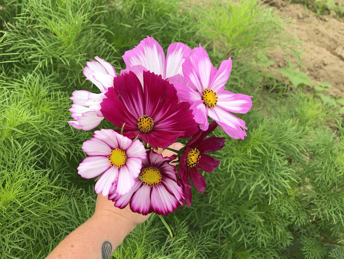 Annual. A bicolor cosmos! Flowers vary in hue from white to pink to rose, with each serrated petal edged in contrasting magenta. Plants grow 4' climaxed by blooms 2½–3" across. A beautiful addition to your cosmos bouquet. Annual. ~140-195 seeds/g.