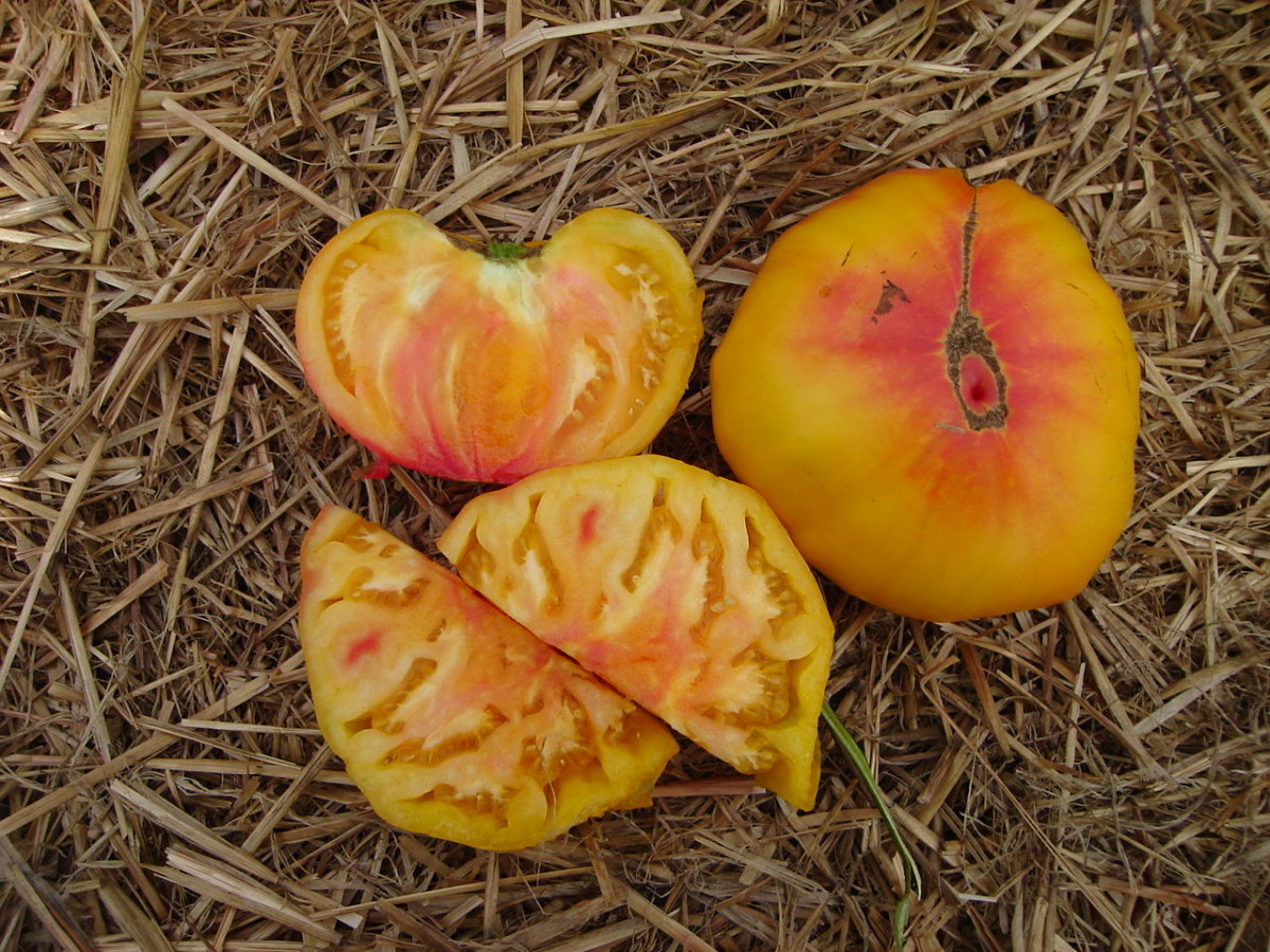 Indeterminate. Garden author Michelle Owen says, “I roast…these exceptionally sweet red-streaked yellow tomatoes…in a hot oven, then sauté with ridiculous amounts of garlic, rosemary and extra virgin olive oil and throw over pasta. Before I face the firing squad, I will ask for this as my last meal.”