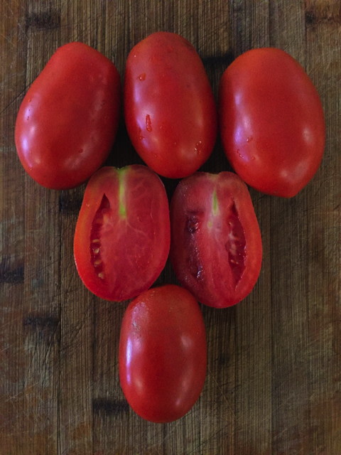 Determinate. Fedco staff whipped up a day-long paste-taste in 2019, saucing 20+ varieties. Plum Regal topped the hybrids and had high marks even compared to some excellent heirlooms. Its deep red sauce was smooth, meaty, with paste-y rich full flavor and a nice acid balance. No bitter or metallic hints, and also did not err into saccharine-sweet tones. Adding to the overall package, Regal is late blight resistant, and moderately resistant to early blight. Even on a determinate plant, the ability to withstand disease pressure really shows up in a high yield. This variety has been making a name for itself among home canners and sauce-makers: you know you will get enough tomatoes and the end results will be delicious. For the ones that don’t ripen, Gisele and Jim McLear report, “we were delighted that the smaller green ones kept well and slowly ripened over the winter; we ate the last one in mid-February and it was still tasty.” High resistance to LB, F, V, TSWV; intermediate resistance to EB. Seed may have an organically certifiable coating.