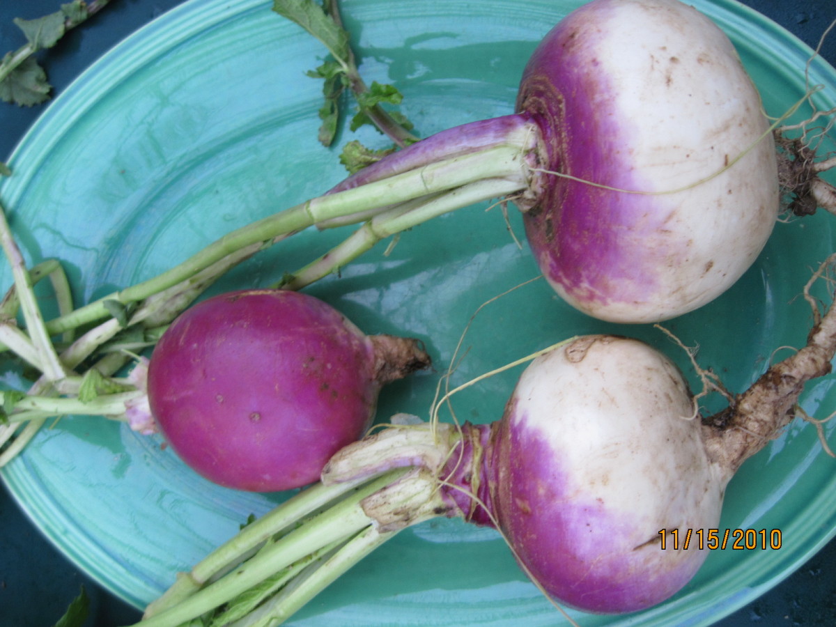 Popular variety with purple tops, white bottoms and white flesh can attain 6" in diameter. An heirloom from before 1880. Starks claimed in 1921 that “other varieties are good, but this one stands in a class by itself.” Sometimes used to feed livestock, but CR likes them in soups, and Joanna eats them up to golf-ball-sized with the greens.
