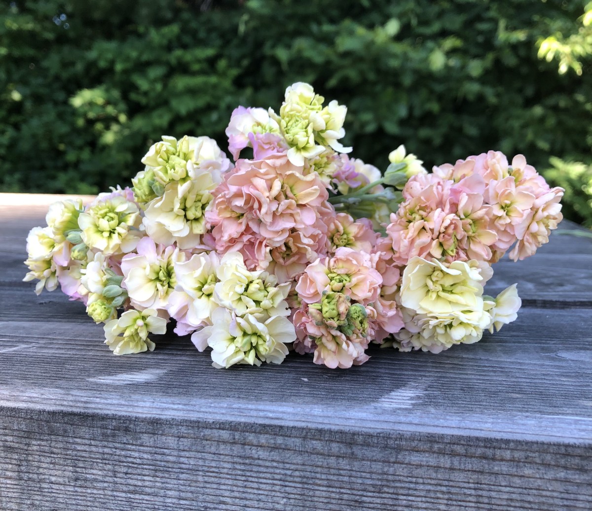 Annual. A bouquet of this stock can perfume an entire room with its deep warm peppery scent, but you won’t be able to resist getting closer and sticking your nose into the flowers. Soft lovely mostly double blooms are like buttercream heaped on sunset-tinged clouds—creamy yellow centers blending into blushed-rose petal edges. Flowers sit atop sturdy 24" stems that branch and bloom continuously for more than 2 months if you keep pinching them back.