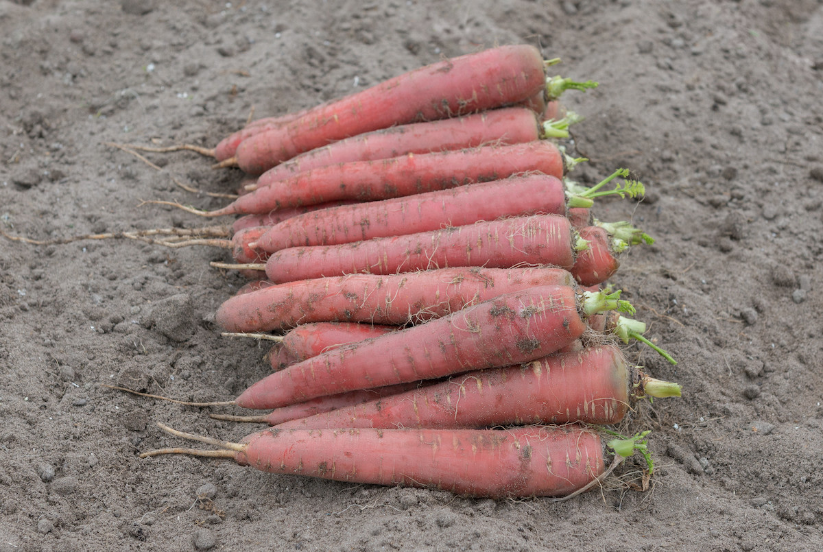 We’ve trialed many a red carrot and most taste like sandy kerosene. Praise in bright bunches to breeder Bejo for bringing us yummy cinnabar-red Redsun. Such a lovely shade, through to the interiors of a near-perfect 7–9" Nantes-type. Mild and sweet with a slight tart zing, crunchy but not tough, carroty with a spring in its step. Recommended for fall harvest only—like Purple Haze (Bejo’s other feather in their colorful carrot cap), hot weather and lack of water can shift the flavor to blech! Contains up to 3% orange off-types