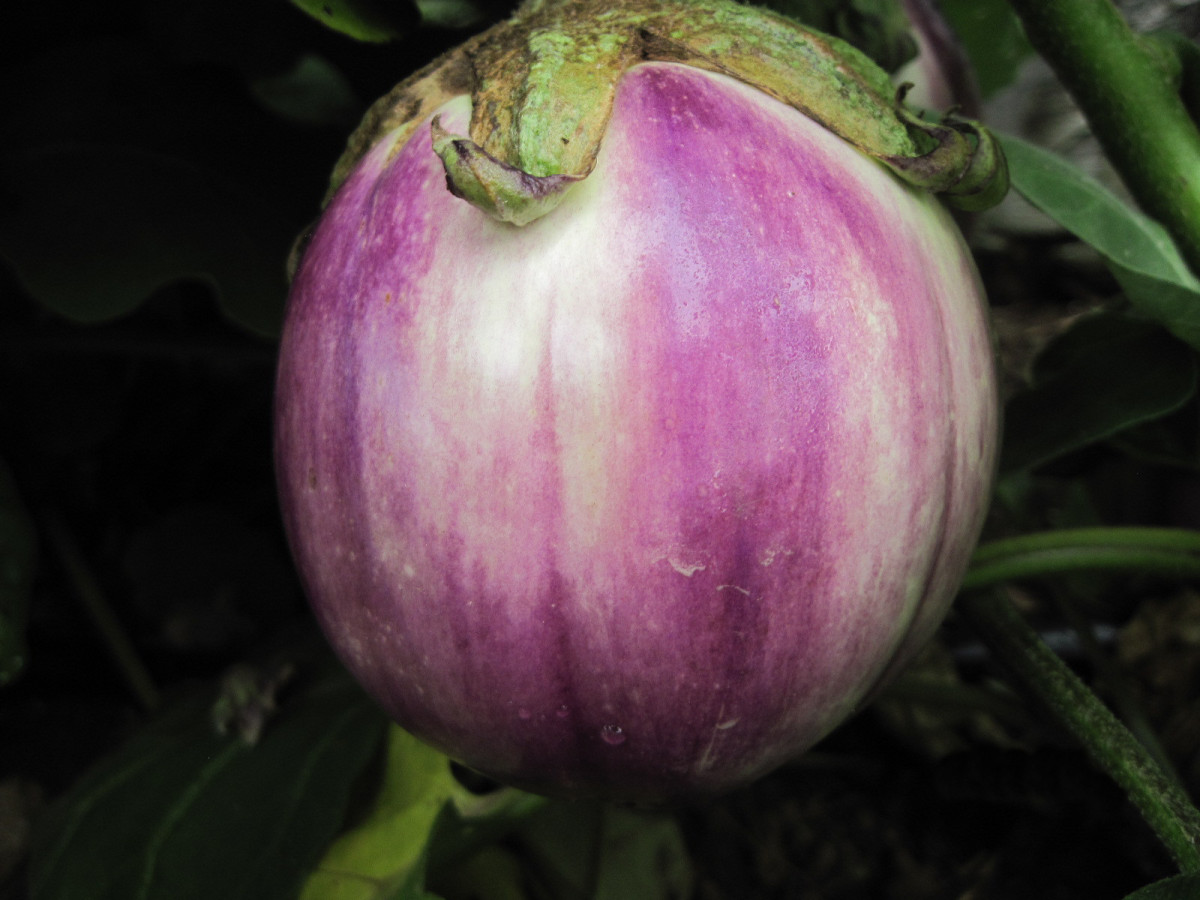 Gorgeous rounded fruits, white with lavender streaking down the side, about 3–4" across and 5" long, narrow at the top and widening with indentations almost like folds in draped fabric. Fruits average 2 lb, max out at 4 lb, LePage’s highest-yielding eggplant. Rosa needs to be coddled, particularly in the northern half of New England. Seed needs alternating temperatures to break dormancy: warm days (preferably 80s), cooler nights (around 70°).