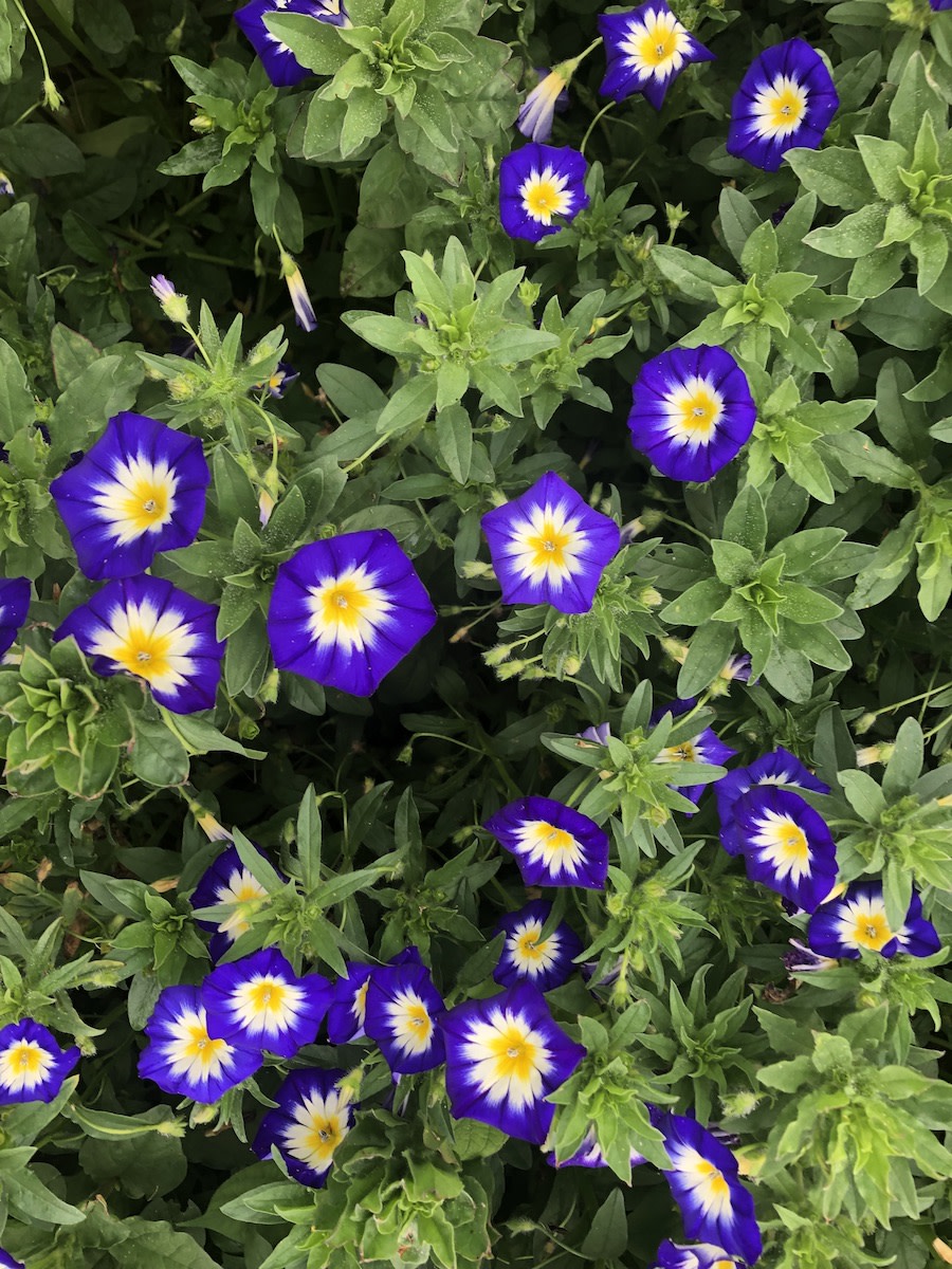 Annual. This bush morning glory charmed us in our 2023 flower trials! Shapely 18" tall bushes (that’s right, no trellising required!) are covered in blooms all summer. Each 2" trumpet appears hand painted, with royal blue exteriors and iridescent white-to-gold centers. Eye-catching in beds, borders and pots. If plants get leggy midsummer, shear them halfway back for abundant reblooms. Direct seed after danger of frost, or start indoors 4–6 before last frost. Space 6–8" apart in full sun.