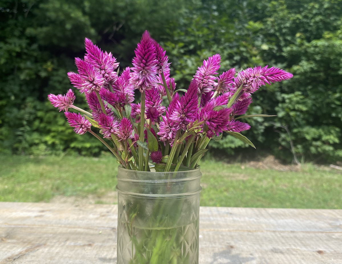 Annual. Upright 20–26" tall multi-branched wheat-type celosia produces showy spikes, light pink at the base turning to a deep rose-magenta at the tip. Green foliage starts at ground level. A prolific and striking display en masse, as a border, or in containers. Excellent cutflower. Blooms July through frost. Hums with bees and other pollinators from mid-afternoon until dusk. Prefers full sun and moist rich soil, though does well in marginal dry soil as well. Does not tolerate standing water. ~1,400 seeds/g.