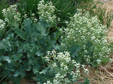 Open-pollinated perennial, probably to Zone 5. Native to the seashores of England and Ireland and popular in Victorian England. Once grown on a large scale as a winter substitute for asparagus, cultivated for its blanched tender delicate ivory-colored leaf stalks that can be boiled or steamed to provide a good source of vitamin C. Sea Kale grows up to 3' forming a beautiful rosette of wavy-edged thick silvery-grey leaves and dense racemes of small white highly fragrant flowers in midsummer.