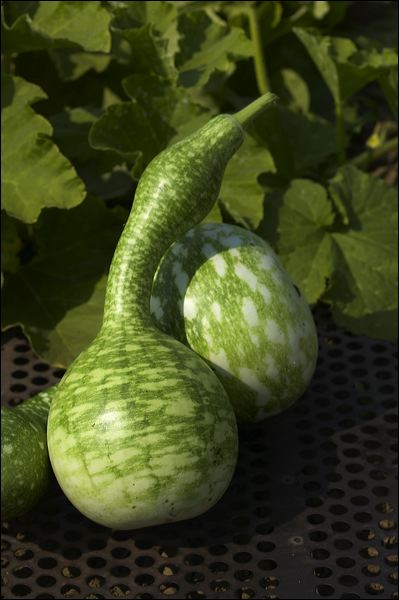Fairgoers gawk at these show-stealers, whether in Jack Kertesz’ demonstration gardens or at our booth or in the Hall, admiring Swan’s beautiful dark green surface with very pale green 1" splotches. Large round 8–10" base tapers into graceful long neck, sometimes straight, sometimes arched, capped by a small bulb near the stem that looks like a swan’s head. The color becomes tan once the gourd is fully dried. Nikos transformed one into a hunter’s harp, swan head and all.