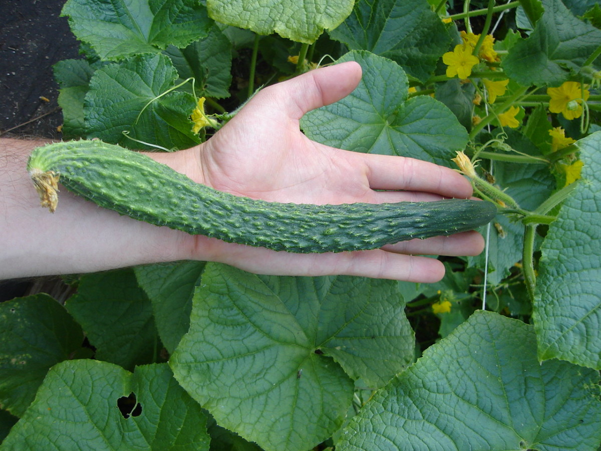 Known for its sweet mild burpless flavor, this Asian cucumber grows up to 15" long with a curly shape if unsupported. For straighter fruit that packs better, Jason Kafka grows these in his greenhouse in vertical hedges, stretching Trellis netting between conduits. According to Tom Vigue these make good dense pickling cukes if picked young enough. Jonathan M. of Maine agrees: “Suhyo is wonderful both fresh and pickled.” Sets well in heat. Resists PM.