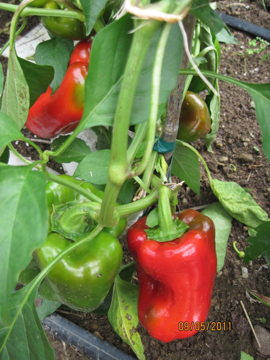 A cinch to grow in the North. CR, no pepper pro, reported counting 54 full-sized and 12 baby peppers on his 11 plants on Sept. 8, 2014— illustrating its potential in a good pepper year. Resists blossom drop even in adverse weather so that almost every flower produces. Fruits thin-walled, not blocky, turn red early, good for the home garden. New Ace is an improvement on the old strain, producing fewer misshapen pointy peppers, but still not a majority of classic blocky 4-lobed commercial peppers. From Ohio, Janine Welsby responds, “Don’t damn them with faint praise! Still the only pepper that consistently ripens gorgeous red bells for us. Maybe they are kind of misshapen but the taste makes up for it.”
