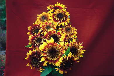 Annual. If your sunflowers need a New Deal, add this Joker to your deck. Joker is a bicolored pollenless beauty with two rings of petals. An interior short yellow fringe resembling eyelashes radiates from the brown disk and accentuates the big orangy-maroon yellow-tipped outer petals. Rated among the best and showiest sunflowers for cutting by horticulturalists at the University of Florida. Mottled red stalks grow 5–7' with multiple branching. ~22 seeds/g.