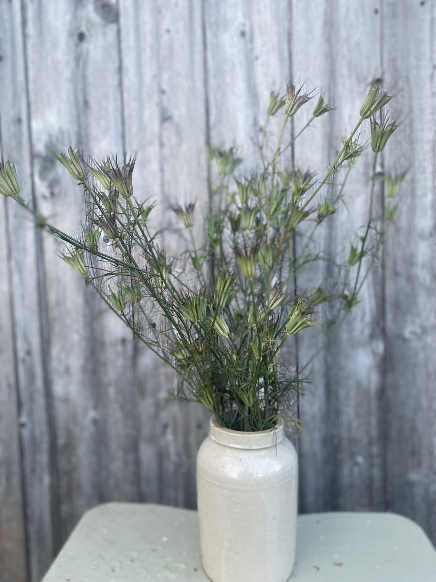 Annual. Extravagant and peculiar! Small showy lemon-yellow flowers on long multi-branched stems appear in early summer and soon transform into jubilant 1½" goblet-shaped seedpods, upright, ribbed, radiating out into needle-thin curved points that turn from green to deep purple. These trumpeting pods are quite distinct from the other nigella we offer, which are ballooned. Similar wispy foliage. 18–24" tall.