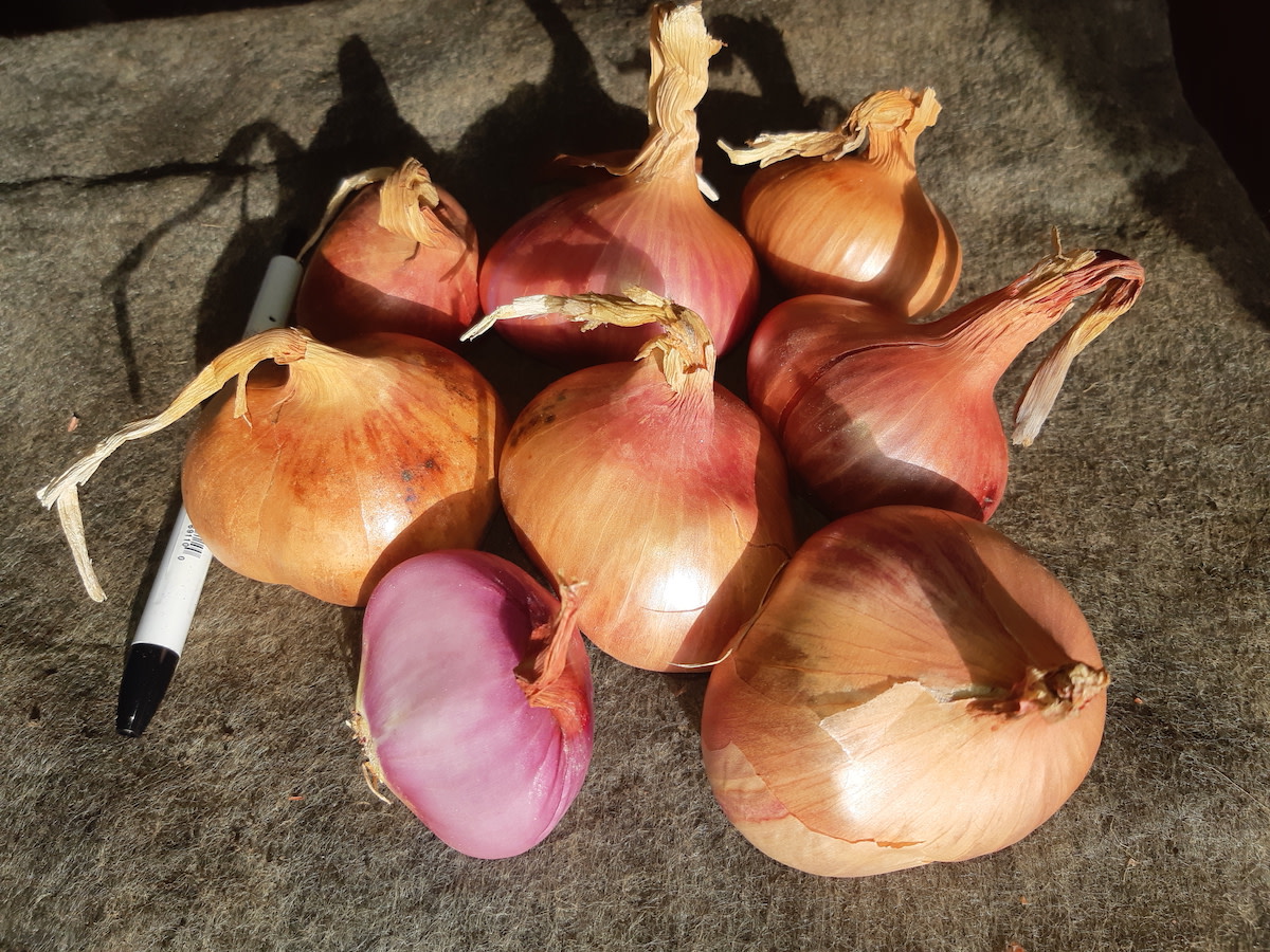 An exciting new French shallot from Canadian plant breeder Richard Favreau of Val-aux-Vents Farm in the Saint-Valérien region of Québec. Richard’s passion and many years of work selecting and evaluating alliums shines through in this variety. Handsome golden-bronze 1¼–2" bulbs uniformly divide into triples and quadruples, store into the spring, and have a luxurious caramel flavor. Resounding praise when we sautéed them in butter in the warehouse kitchen! Wowed us at every point in the season. Donna Dyrek’s were out of the ground curing on September 10 from an April 13 start. About 278 seeds/gram.
